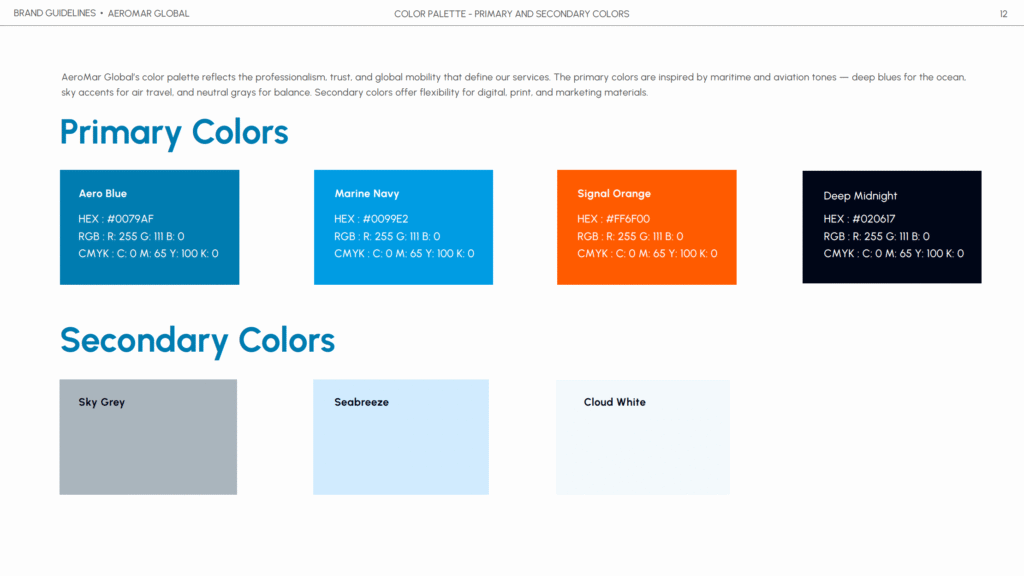 We began with an in-depth discovery phase to understand AeroMar’s values, goals, and target market. Through workshops and competitor research, we defined the brand personality as innovative, dependable, and future-focused.
